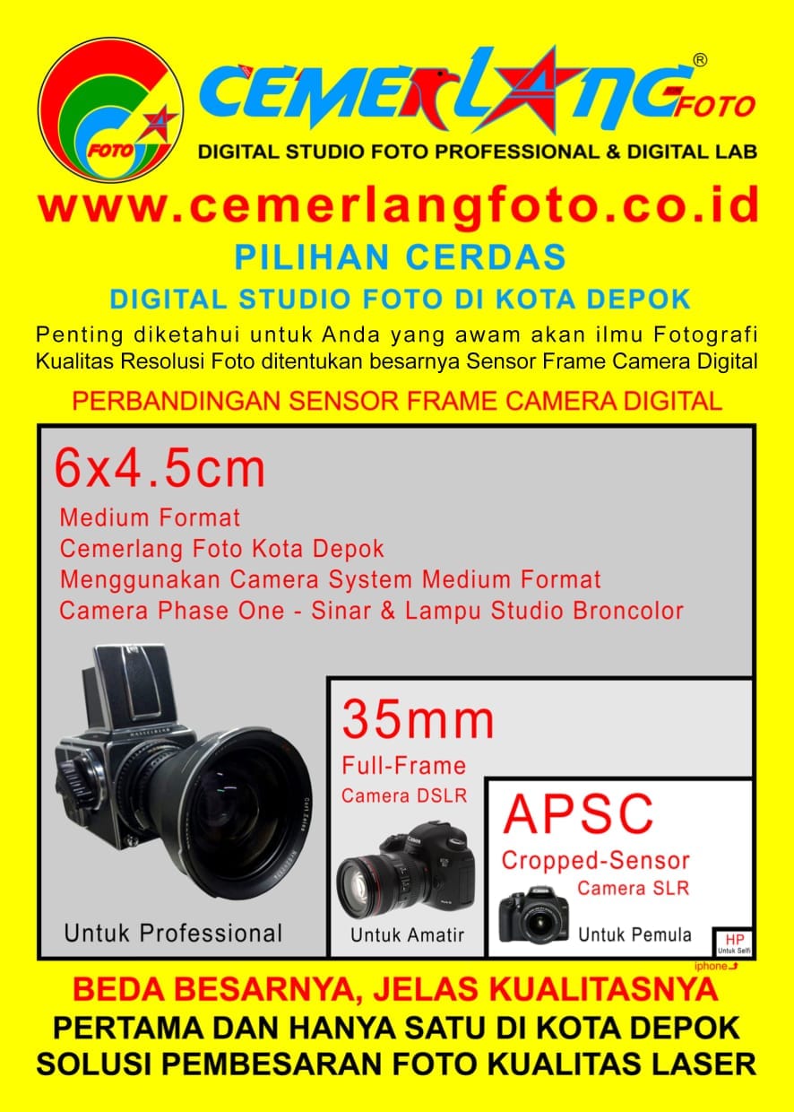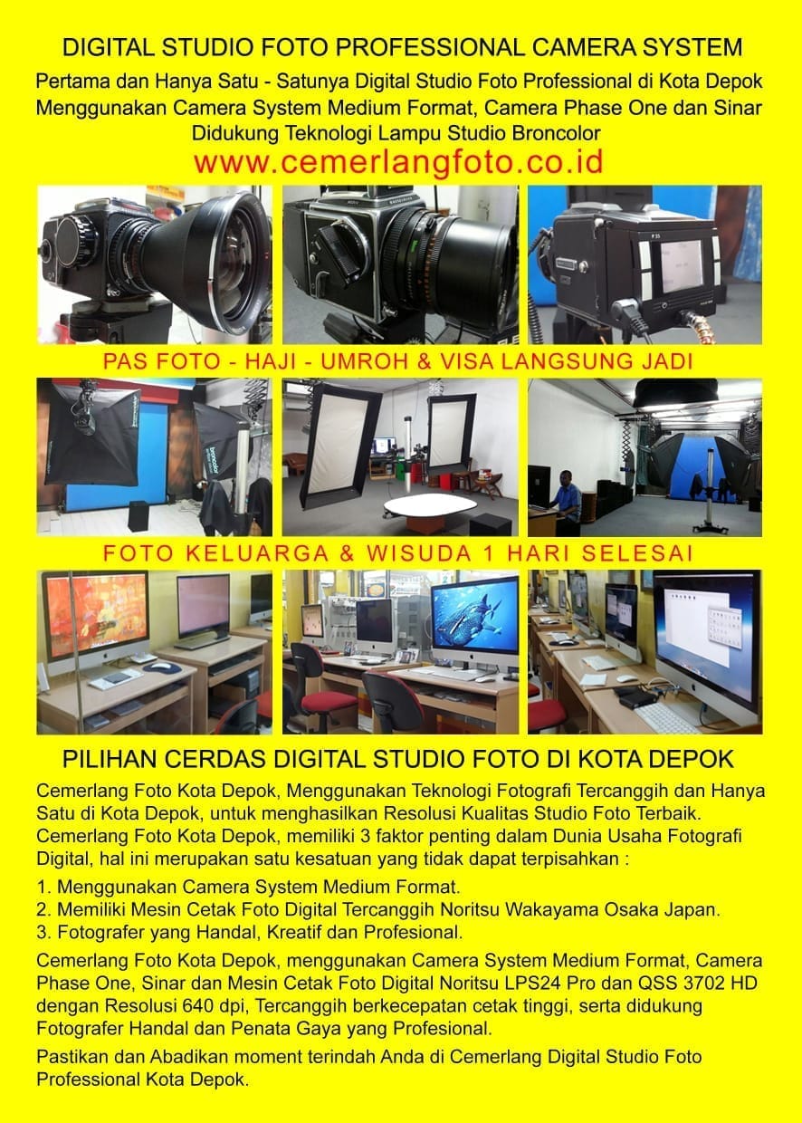 Cemerlang Foto Kota Depok menggunakan Camera System Medium Format, Camera Phase One, Sinar dan Mesin Cetak Foto Digital Noritsu LPS24 Pro dan QSS 3702 HD dengan Resolusi 640 dpi.