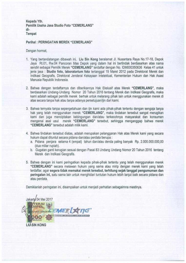 Pastinya saya sangat keberatan, sebagai pemilik merek saya tidak pernah mengizinkan orang lain untuk menggunakan merek Cemerlang Foto yang sudah saya daftarkan ke Kemenkum HAM untuk digunakan sebagai satu-satunya pemilik sah merek tersebut sekaligus sebagai HAKI yang dilindungi Undang-Undang. Atas penggunaan merek tersebut saya merasa dirugikan, dan untuk saat ini saya mulai melakukan peneguran kepada beberapa Studio Foto yang secara sengaja menggunakan nama Cemerlang Foto sebagai merek dagangnya di seluruh Indonesia, dan bila ada yang membandel saya akan bersikap tegas dengan mengambil langkah hukum dengan memperkarakannya sesuai peraturan dan ketentuan UU yang berlaku,” tandas Liu saat melakukan konferensi pers di Taman Kota I, BSD, Tangerang Selatan, Minggu (2/4) siang.