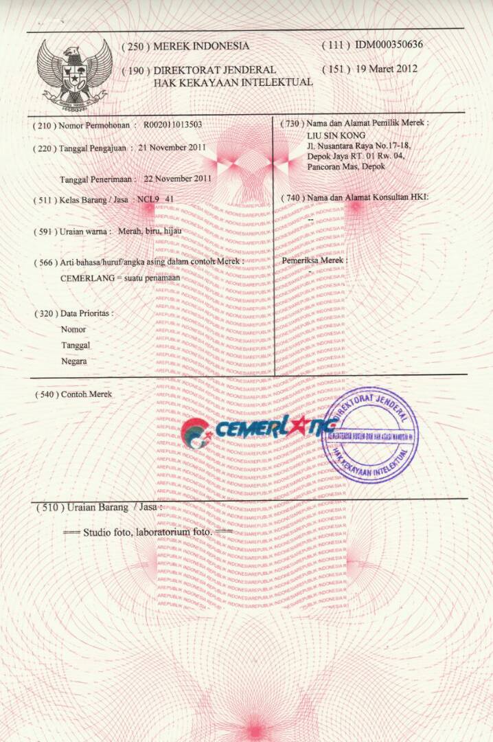 Menurut Liu, merek dagang Cemerlang yang telah terdaftar di Kementerian Hukum dan Hak Asasi Manusia dengan Sertifikat Merek Nomor IDM00035636 tanggal 19 Maret 2012 itu merupakan Hak Kekayaan Intelektual (HAKI) yang telah digunakannya sejak 1986. Sementara, dilain pihak ada oknum pengusaha tertentu yang juga menggunakan nama Cemerlang Foto sebagai merek dagangnya tanpa lebih dahulu meminta izin kepada Liu.